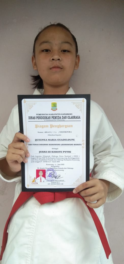 SD Tunas Dharma | SD Tunas Dharma kembali mencatatkan hasil prestasi yang membangggakan, karena baru-baru ini salah seorang siswinya atas nama Queenza Maria Guadeloupe (Kelas 6B) berhasi memenangi posisi Juara III dalam Olimpiade Olahraga Siswa Nasional atau O2SN Tingkat Kabupaten Karawang Tahun 2025, yang diselanggarakan oleh Dinas Pendidikan, Pemuda dan Olahraga Kabupaten Karawang, di Cabang Olahraga Karate. Sebagaimana diketahui, O2SN adalah singkatan dari Olimpiade Olahraga Siswa Nasional, yakni sebuah ajang kompetisi olahraga yang diselenggarakan untuk siswa-siswi dari berbagai jenjang pendidikan di Indonesia. Adapun ajang ini bertujuan untuk menjaring bibit-bibit atlet potensial agar bisa mengembangkan prestasi olahraga di kalangan pelajar di Indonesia.