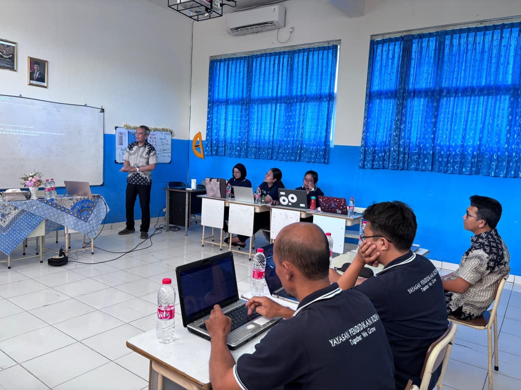 SMP Tunas Dharma | Pada hari Senin, 15 Desember 2025 SMP Tunas Dharma menggelar acara Bimbingan Teknis Koding dan Kecerdasan Artifisial yang diperuntukkan bagi seluruh guru. Adapun selaku trainer dari Bimtek ini adalah dosen dari Sekolah Tinggi Manajemen Informatika dan Komputer (STMIK) Rosma, yaitu Bapak Yudiana, ST., M.Kom., dan Bapak Rahmat Gunawan, S.Kom., M.Kom. Keduanya merupakan dosen di Program Studi Teknik Informatika STMIK Rosma. Acara berlangsung di ruang kelas SMP Tunas Dharma, yang dimulai pada pukul 08:00 – 12:30 Wib. Bimbingan Teknis Guru Koding dan Kecerdasan Artifisial ini adalah program pelatihan yang sinkron dengan program di Kementerian Pendidikan Dasar dan Menengah RI, dalam rangka membekali para guru dengan kemampuan pemrograman atau coding dan AI, agar bisa mengintegrasikannya ke dalam pembelajaran guna meningkatkan literasi digital, logika, dan kemampuan pemecahan masalah siswa di era digital saat ini melalui materi dasar koding, aplikasi AI, hingga praktik pembuatan proyek, serta melatih mereka menjadi fasilitator bagi guru lain.